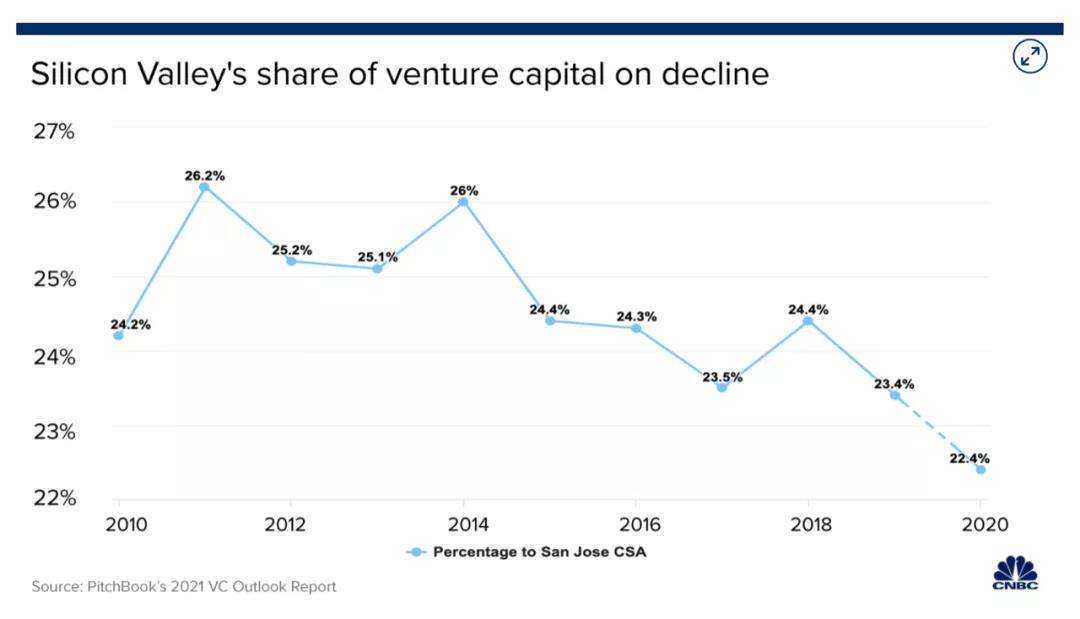 近年来,随着其他创新热点的兴起,硅谷的风险投资额占比有所下降,但是,仍然在20%到四分之一之间。