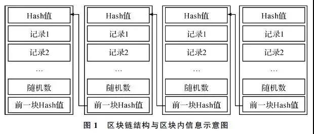 区块链(blockchain)是由区块(block)串联起来组成的链(chain)。每个区块的内容包含若干信息(通常是交易记录),还包含一个代表区块的哈希值(Hashvalue)以及代表前一个区块的哈希值(如图1)。当对某一区块中的一条信息进行修改时,不仅会改变这一区块的哈希值,还会导致其后的所有区块的哈希值发生改变。因此,除非构造一条从该区块之前的区块开始的分叉,并且得到全网络的认可,否则无法对某个区块的内容进行篡改。