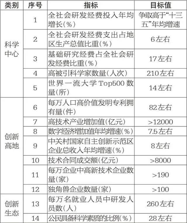 “科学中心”建设取得新进展。全社会研发经费支出占地区生产总值比重保持在6%左右,力争在核心领域取得重要技术突破和引领性原创发现。“创新高地”建设实现新突破。在人工智能等前沿技术领域实现全球领先水平,突破一批“卡脖子”技术。培育一批具有全球影响力的科技领军企业。“创新生态”营造形成新成效。创新创业生态系统持续优化,国际化配置资源能力显著增强,创新要素流动更加顺畅,国际科技合作交往全方位加强。全民科学素质显著提升。制约科技创新的障碍进一步破除。