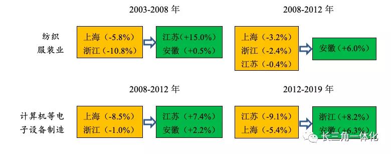 以纺织服装业为例,2003-2008年,上海和浙江份额显著下降,江苏增长明显;2008-2012年,上海、浙江持续下降,江苏也开始略微下降,安徽显著增加。