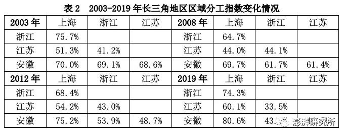 在长三角地区,江苏、浙江、安徽基本上都是围绕上海开展合作,积极承接上海产业转移,这也是2003-2019年上海与其他三个省分工专业化指数不断上升的主要原因,而对于三省之间合作的重视程度明显低于与上海方向,同时承接产业转移也使得产业结构有趋同倾向。