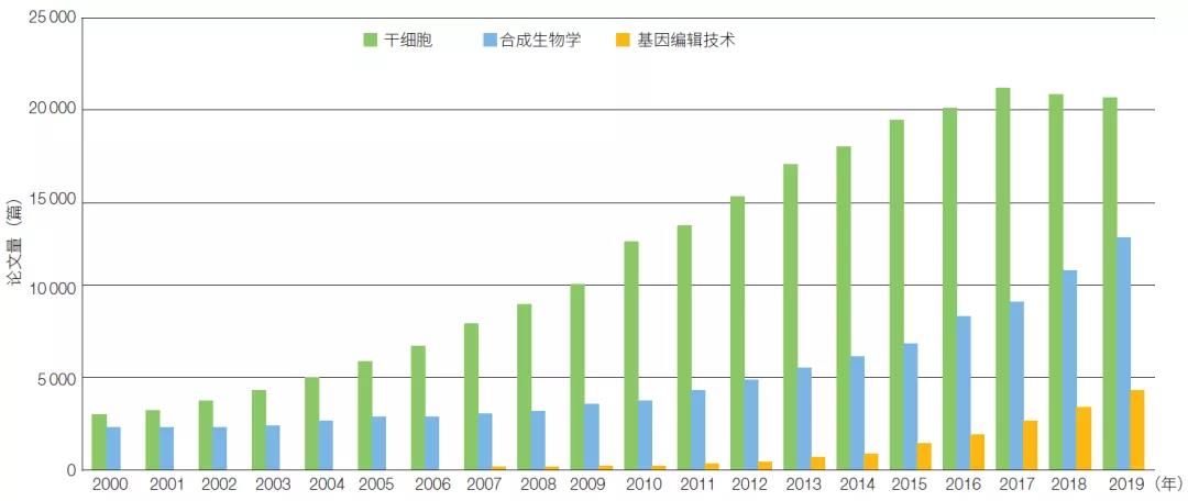 图1 2000—2019 年干细胞、合成生物学、基因编辑相关研究论文全球年度分布