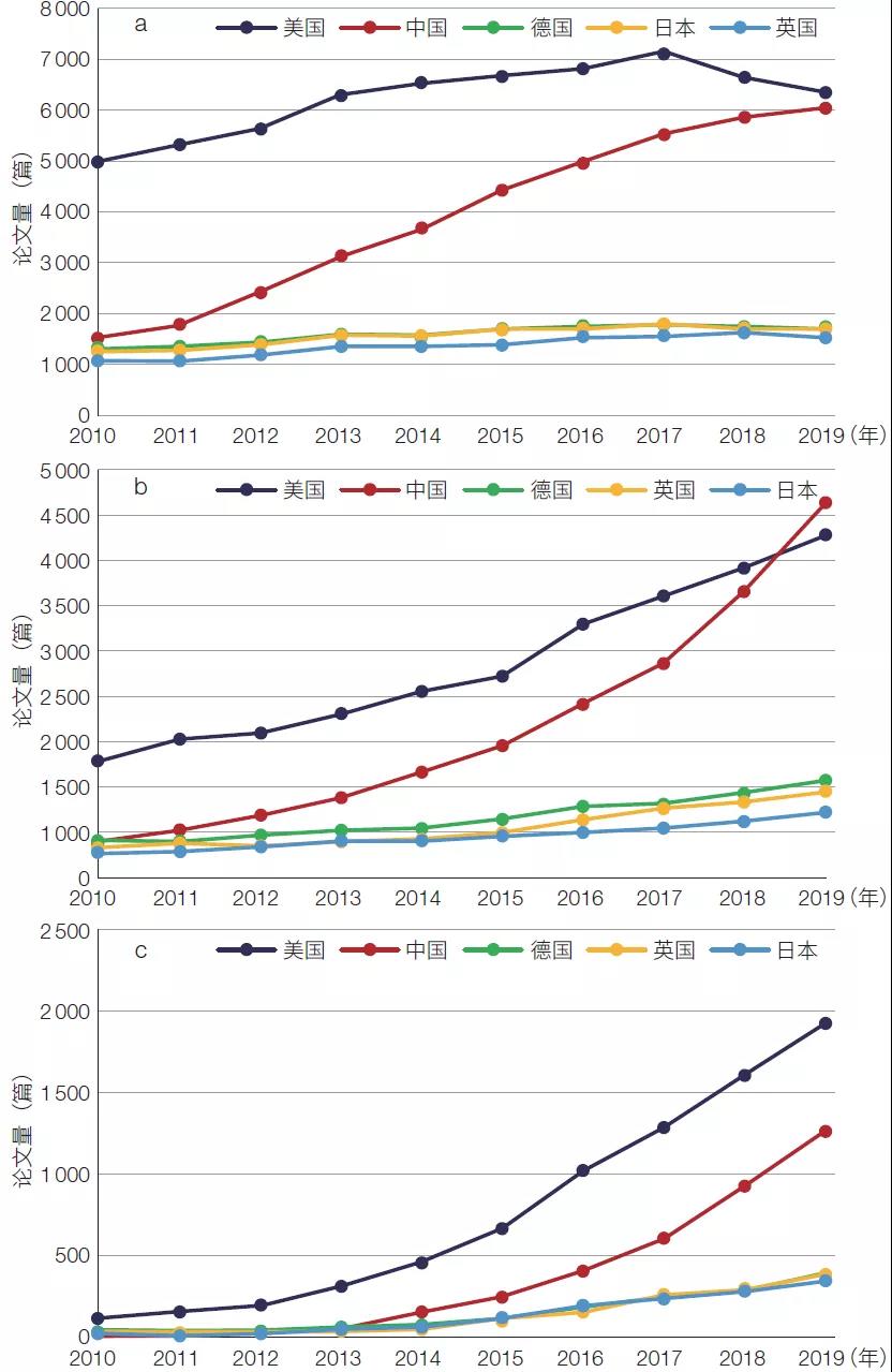 图2 2010—2019 年干细胞(a)、合成生物学(b)、基因编辑领域(c)论文量排名前五国家的论文年度分布