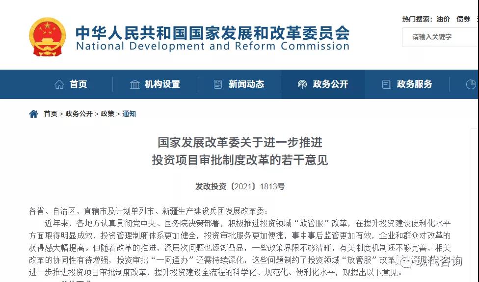 投资项目审批制度改革的若干意见发改投资〔2021〕1813号各省、自治区、直辖市及计划单列市、新疆生产建设兵团发展改革委:近年来,各地方认真贯彻党中央、国务院决策部署,积极推进投资领域“放管服”改革,在提升投资建设便利化水平方面取得明显成效,投资管理制度体系更加健全,投资审批服务更加便捷,事中事后监管更加有效,企业和群众对改革的获得感大幅提高。但随着改革的推进,深层次问题也逐渐凸显,一些政策界限不够清晰,有关制度机制还不够完善,相关改革的协同性有待增强,投资审批“一网通办”还需持续深化,这些问题制约了投资领域“放管服”改革向纵深推进。为进一步推进投资项目审批制度改革,提升投资建设全流程的科学化、规范化、便利化水平,现提出以下意见。一、总体要求以习近平新时代中国特色社会主义思想为指导,深入贯彻党的十九大和十九届历次全会精神,围绕全面改善投资环境,立足统筹指导,坚持规范审批与优化服务并重,着力明确政策界限,着力完善制度机制,着力增进改革协同,不断提升投资项目在线审批监管平台(以下简称投资在线平台)创新应用水平,规范有序深化投资项目审批制度改革,为充分激发社会投资活力和动力,继续发挥投资对稳定经济增长的关键作用提供有力支撑。二、进一步明确和简化投资审核管理(一)加快健全投资管理制度体系。深化投资领域“立改废”,加快修订中央预算内直接投资、投资补助、贷款贴息,以及企业投资项目核准和备案管理等制度规范,增强投资法规制度的统一性和协调性,不断提升投资决策科学化、制度化、规范化水平。尚未出台政府投资法规配套制度的地方,要进一步加大工作力度,尽快推动出台政府投资地方性法规制度,细化本地区政府投资管理的法定职责、程序和机制,为统筹安排、规范使用各类政府投资资金提供制度保障。(二)严格投资审批事项管理。对有明确法律法规依据的审批事项,各地方应在《全国投资项目在线审批监管平台投资审批管理事项统一名称和申请材料清单》(发改投资﹝2019﹞268号)基础上,梳理形成本省区域内统一的投资审批清单和申报材料清单。同时,积极履行投资综合管理职责,严格控制新增或变相增设审批环节,对涉及新增或以“服务”“登记”等名义变相增设投资审批环节的,要严格把关。对企业能够自主决定、市场能够有效调节、行业组织或者中介机构能够自律管理、行政机关采用事后监督等方式能够解决的审批事项,要及时推动取消。(三)简化特定政府投资项目审批管理。落实《政府投资条例》有关规定,对列入相关发展规划、专项规划和区域规划范围的政府投资项目,可以不再审批项目建议书;对改扩建项目和建设内容单一、投资规模较小、技术方案简单的项目,可以合并编制、审批项目建议书、可行性研究报告和初步设计;根据《突发事件应对法》《国家突发公共事件总体应急预案》,为应对自然灾害、事故灾难、公共卫生事件、社会安全事件等突发事件需要紧急建设的政府投资项目,可以在合并编制报批文件、简化审批程序的基础上,通过建立绿色通道、部门集中会商等方式,提高审批效率。对于《政府投资条例》第十三条第一款第三项规定属于地方审批权限的,其建设内容单一、投资规模较小、技术方案简单的政府投资项目的具体范围,由各省、自治区、直辖市和计划单列市、新疆生产建设兵团发展改革委作出具体规定,报国家发展改革委(投资司)。三、进一步创新和优化投资审批程序(四)推进实施企业投资项目承诺制。以优化投资环境为目标,规范有序实施以“告知承诺+事中事后监管”为核心的企业投资项目承诺制改革。坚持政府定标准,各地方发展改革部门要会同或推动有关部门以法律法规设定的标准作为准入承诺标准,除关系国家安全和生态安全、涉及全国重大生产力布局、战略性资源开发和重大公共利益外,分行业分领域研究提出企业投资项目实施所涉及的审批事项承诺内容和标准。坚持企业作承诺,对符合要求的企业投资项目,由企业自主选择并按照政府制定的标准作出具有法律效力的书面承诺,企业依法依规开展相关工作。坚持过程强监管,各地方发展改革部门要会同或推动有关部门加强对项目推进过程的监管,明确监管重要节点和相应监管要求,并纳入投资在线平台实行动态监督。坚持信用有奖惩,各地方发展改革部门要推动有关部门对照承诺和标准依法依规对项目组织验收,通过验收的项目方可投入使用,达不到承诺要求的项目要督促整改到位,情节严重的依法依规予以惩戒。(五)创新投资在线平台建设应用。结合党史学习教育“我为群众办实事”活动,在强化信息资源共享基础上,各级发展改革部门要依托投资在线平台,建立地方和企业反映投资审批问题的办理和反馈机制,梳理形成高频次咨询事项的统一答复口径,并向社会公布;对涉及其他部门的问题,要建立转办机制,并及时跟踪办理进度。要不断拓展投资在线平台应用领域,以固定资产投资项目代码为基础,研究加强与银行、基金等金融机构信息系统的互联共享,推动解决企业和金融机构融资对接难题。利用投资在线平台归集的项目和审批信息,探索运用大数据分析技术开展投资意向分析等,为研判投资趋势、服务投资调控提供支撑。(六)总结推