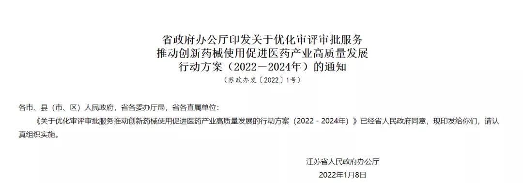 为深入贯彻落实《省政府印发关于促进全省生物医药产业高质量发展若干政策措施的通知》(苏政发〔2021〕59号)要求,聚焦创新药品医疗器械上市、使用堵点难点问题,优化审评审批服务,促进医药产业高质量发展,制定本行动方案。