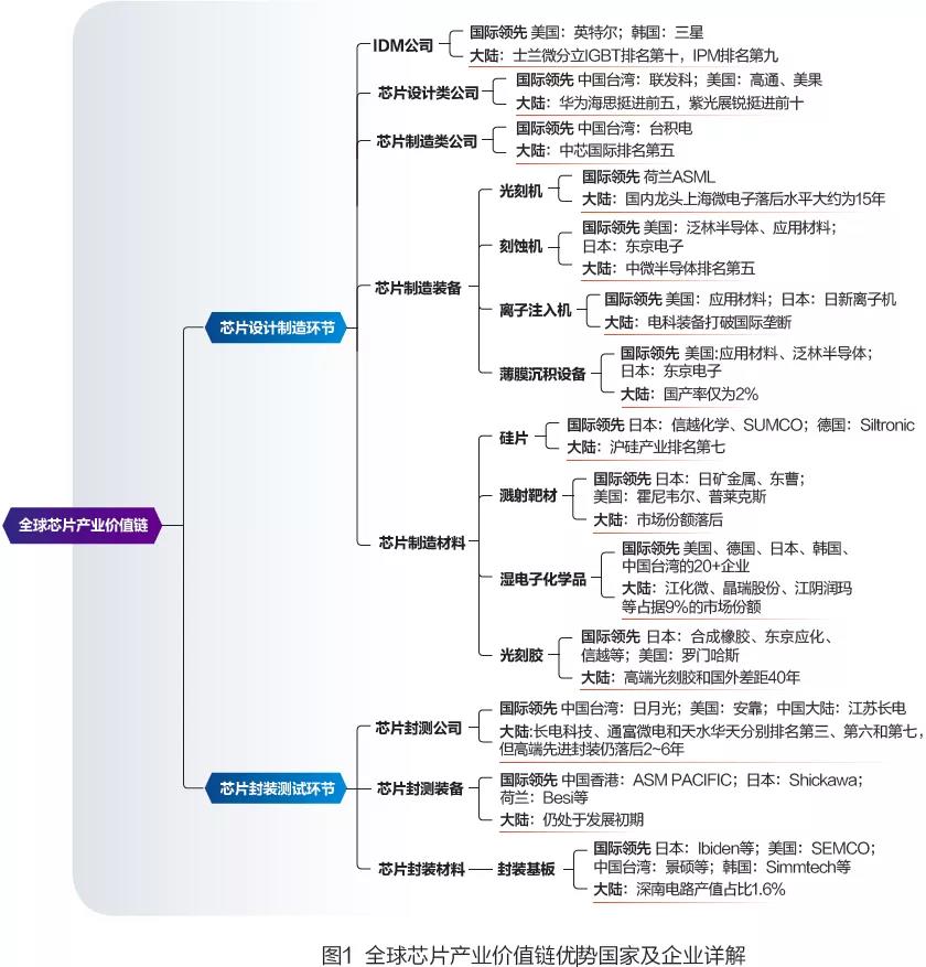从图中可以看到,在芯片设计类、制造类及芯片封测企业、刻蚀机这几大环节中处于较为领先的位置,在IDM企业、离子注入机、硅片、湿电子化学品、封装基板这几大环节处于中等水平,而在光刻机、薄膜沉积设备、溅射靶材、光刻胶、芯片封测设备这些环节,中国大陆的地位则相对落后。