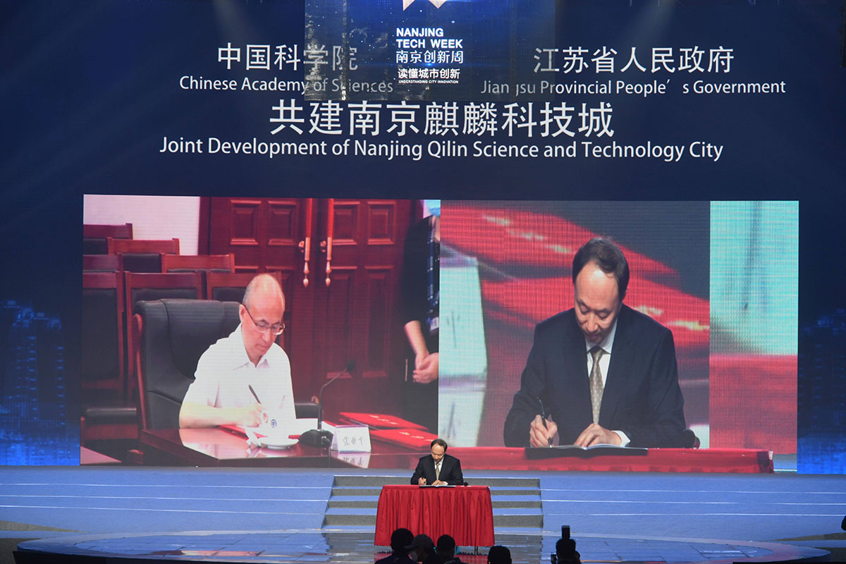 622“2020”开幕式上,中科院与江苏省政府举行《中国科学院江苏省人民政府共建南京麒麟科技城推动南京综合性科学中心建设打造南京区域创新高地合作协议》云签约仪式,中科院院长、党组书记白春礼出席开幕式并致辞。中科院副院长、党组成员张亚平与江苏省副省长马秋林代表院省双方签署。南京市市长韩立明主持。