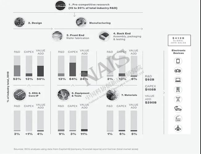 半导体的设计和制造非常复杂,半导体行业呈现出高研发和高资本密集的双重态势。总体而言,该行业在2019年全球价值链活动中的研发投资约为900亿美元,资本支出约为1100亿美元,没有任何一个行业在研发和资本支出方面具有类似的高强度。同时,这种极高的投资强度需要全球化和专业化来支撑。
