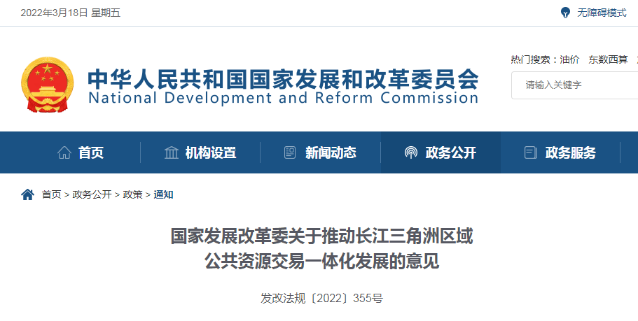 3月18日,国家发展改革委网站发布《关于推动长江三角洲区域公共资源交易一体化发展的意见》。
