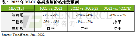 2022年下半年消费类MLCC报价压力未减,恐持续下探,预估平均仍有3~6%的降幅。工业类利基型MLCC价格则反之,有望在客户端芯片短缺纾解下,促使拉货动能增温,降幅维持在1~2%,甚至持平,而属于年度报价的车规MLCC价格,则是维持价量平稳。