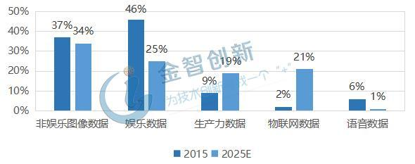 我国数据量庞大,但是整体价值密度较低。本轮大数据的发展主要得益于互联网的普及,随之而来的是我国数据资源价值量偏低、标准化与准确性偏低、整体利用率不高的现状。如图2所示,从2015年我国数据资源分布结构方面来看,数据信息价值量较低的娱乐数据占比最高为46%,其次是非娱乐图像数据占比37%,而数据信息价值含量较高的生产力数据与物联网数据合计占比仅为11%,尽管近几年我国物联网在逐渐发展,工业数据与物联网数据也在不断累计,但是由于物联网的发展尚处于探索阶段,高价值的物联网数据尚未呈现出爆炸式的增长格局,目前我国仍有将近一半的数据资源为价值含量较低的娱乐数据。