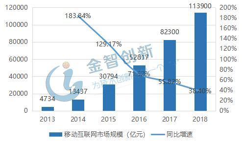 图3 2013-2018年我国移动互联网市场规模及同比增速