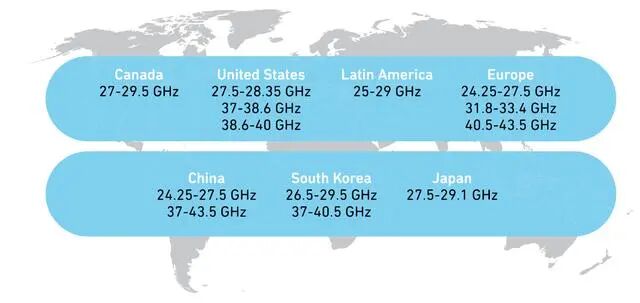 从现阶段的5G毫米波格局来看,美国、韩国、日本等国家已陆续完成5G毫米波频谱的划分与拍卖,5G商业部署前景明朗,产业链较为集中。他们在毫米波部署初期,大多数的国家将注意力都集中在26GHz和28GHz这两个频段上,在这两个频段上投入的资源也是最多的。