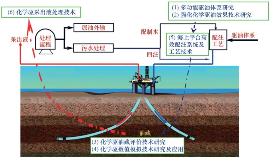 通过持续攻关,中国逐步形成海上油田高效开发技术体系,有力支撑渤海油田稠油开发,其中最具代表性的就是海上化学驱技术(图 5)。