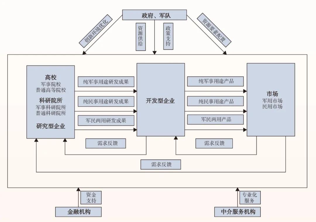 “三分法”等主流观点认为 ,区域军民科技协同创新生态系统的构成要素包括某个特定区域内的军民科技协同创新主体、创新环境和创新资源。其中,主体要素不仅包括政府、民营企业、普通高等院校、地方科研院所、中介服务机构和金融机构等与一般创新生态系统相似的常规主体,军队、军事科研院所、军工企业、军事高等院校等涉及军队或军工业务的各类微观组织在系统中发挥了更为突出的作用。