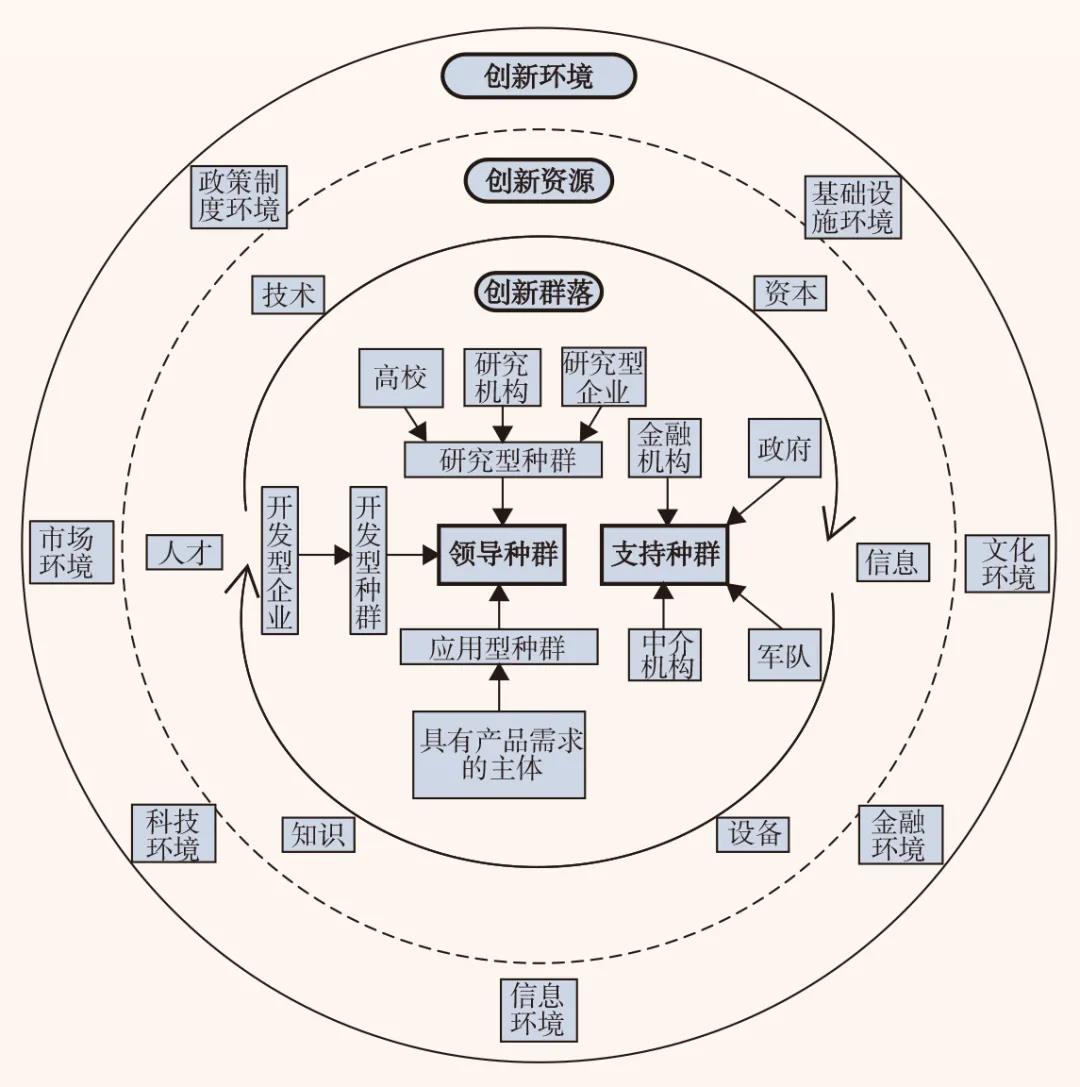 创新生态系统是多个创新主体之间基于某些技术、人才、市场、运作模式、文化等共同创新要素而形成的,相互依赖、共生共赢,并且具有一定稳定性、独立性的组织体系。本文认为区域军民科技协同创新生态系统是在党和国家的统一领导下,特定区域内的各类微观主体发挥区域军民科技协同创新的比较优势,整合区域资源力量,优化区域资源配置,为实现区域军民科技协同创新而形成的相互合作、相互依存、风险共担、利益共享的组织体系。