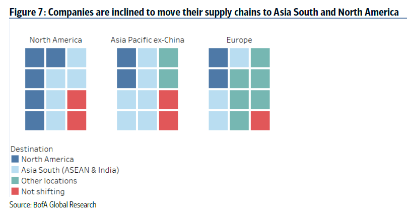 在美洲银行全球研究部的一项研究,其涉及3000家公司,覆盖全球12个行业的调查数据显示,企业倾向于将其供应链移回其国家/地区边界内,最好是移至其盟国,或更靠近其商品和服务的消费市场。