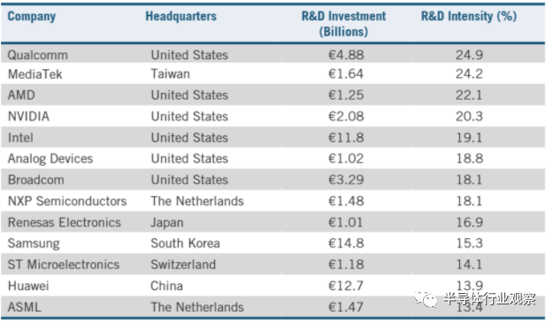 表1:2019年欧盟工业研发投资排行榜上的领先半导体投资公司