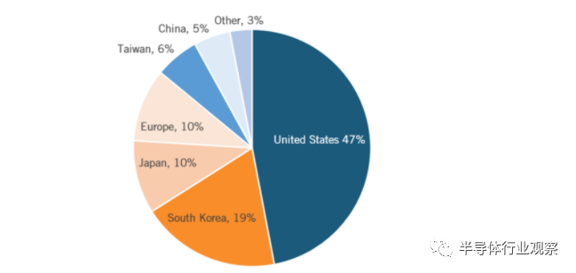 半导体行业本身就是一个价值4700亿美元的高度全球化的行业(预计到2026年将达到7300亿美元的行业),2019年有史以来首次出货超过1万亿个半导体,其中一些处理器包含超过300亿个晶体管。2019年,总部位于美国的半导体企业在全球半导体行业占有47%的市场份额,其次是韩国(占19%),日本和欧洲(占10%),中国台湾(占6%)和中国大陆(占5%)。(参见图1)