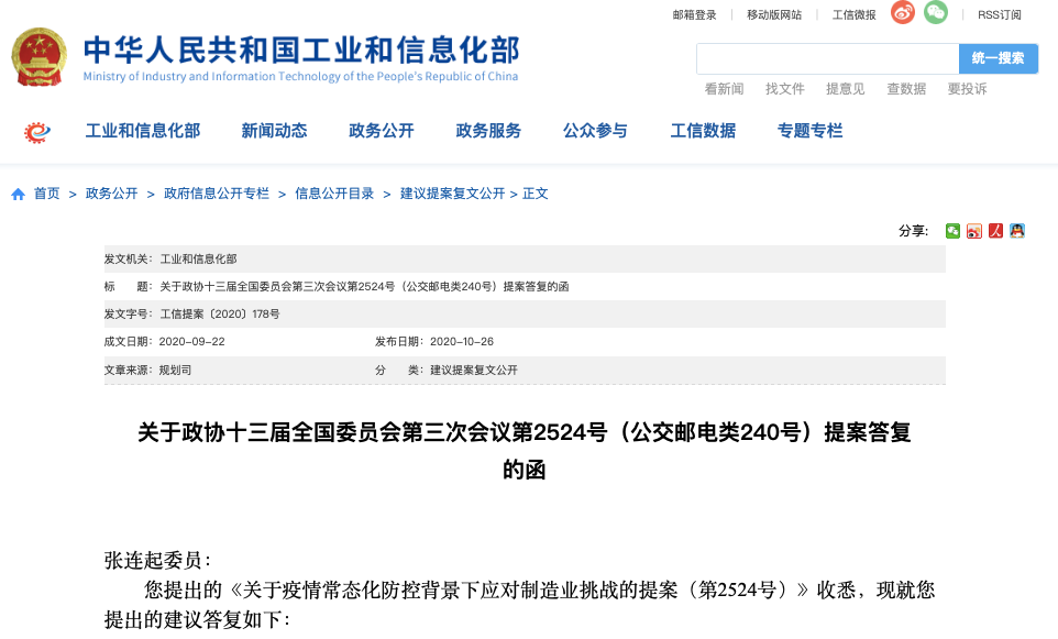 10月26日消息,工业和信息化部在关于政协十三届全国委员会第三次会议第2524号提案答复的函中表示,下一步,工业和信息化部积极考虑将5G、集成电路、生物医药等重点领域纳入 “十四五”国家专项规划,进一步引导企业突破核心技术,依托重大科技专项、制造业高质量发展专项等加强关键核心技术和产品攻关,加强技术领域国际合作。
