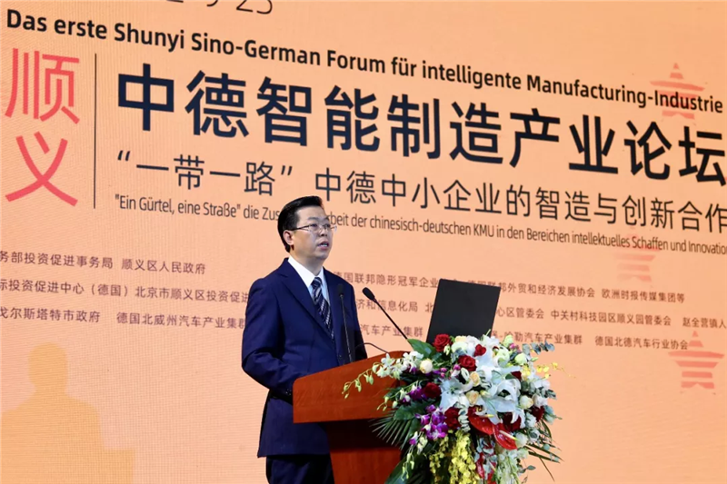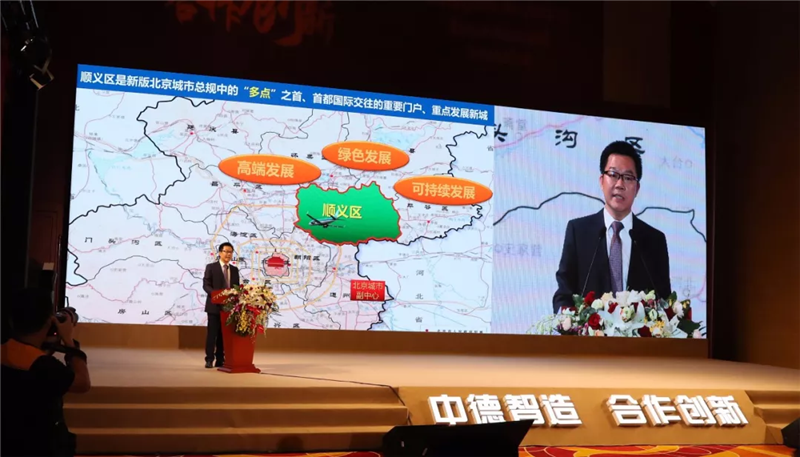 顺义区副区长支现伟代表顺义区委区政府致贺词。支现伟首先对首届中德投资合作与智能制造产业对接会选择顺义作为举办地表示感谢,并对与会代表表示热烈欢迎。支现伟对顺义的区位优势、产业优势、交通优势、配套服务和政策优势等良好投资环境作了简要介绍,并欢迎德国智能制造企业前来顺义中德产业园投资兴业。