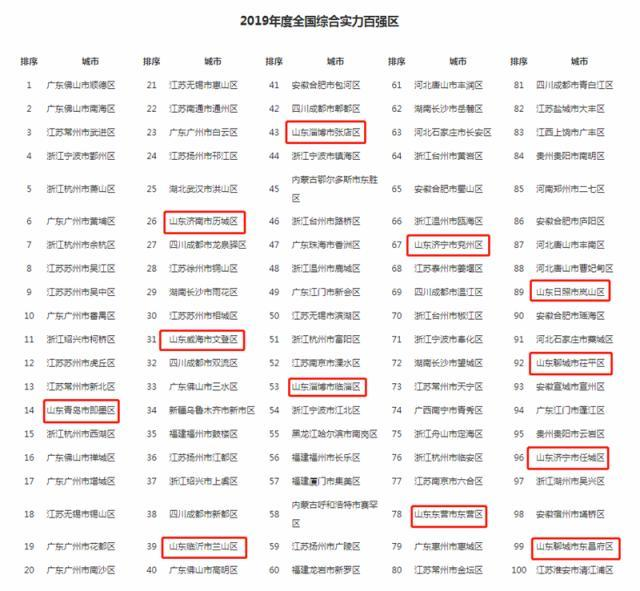 2019年度全国综合实力百强区名单中,山东占12席,分别是青岛市即墨区(全国第14位)、济南市历城区(全国第26位)、威海市文登区(全国第31位)、临沂市兰山区(全国第39位)、淄博市张店区(全国第43位)、淄博临淄区(全国第53位)、济宁市兖州区(全国第67位)、东营市东营区(全国第78位)、日照岚山区(全国第89位)、聊城市茌平区(全国第92位)、济宁任城区(全国96位)、聊城东昌府区(全国第99位)。