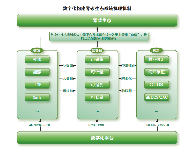 构建“零碳”的经济社会运行生态系统是实现绿色可持续发展的必由之路。“零碳生态”是指通过一定的技术手段和机制方法使某一范围内的生产经营活动中碳排放量降至最低,并在综合效果上使碳排放量小于等于碳吸收量。由于人类的各类生产生活永远都存在正碳,所以实现碳中和一方面要改变能源和产业结构,降低能耗、将碳排量降至最低,更重要的一方面还是对各种行为的碳源进行追踪、检测和计算,将碳源与碳汇进行有效的连接,在整体上实现碳排放量为零甚至碳排放量为负值。而数字化凭借自身的技术和平台化特点,可以有效打通生产生活各领域场景,提高各领域的生产经营效率,降低碳排放量;同时,数字化以先进的数字智能技术为依托,通过多边的协同平台及运营模式,可以实现各领域内的碳排放可计算、可采集,并将碳源与碳汇进行高效连接,正负的相互抵消中和才能实现零碳的最终目的。
