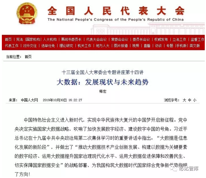 十三届全国人大常委会第十四次会议26日下午在北京人民大会堂闭幕。栗战书主持会议。闭幕会后,十三届全国人大常委会举行第十四讲专题讲座,栗战书委员长主持。中国科学院院士、中国人民解放军军事科学院副院长梅宏作了题为《大数据:发展现状与未来趋势》的讲座。以下是讲座全文。