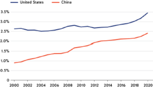 图 1. 2000-2020 年国内研发总支出占 GDP 总额的比例3