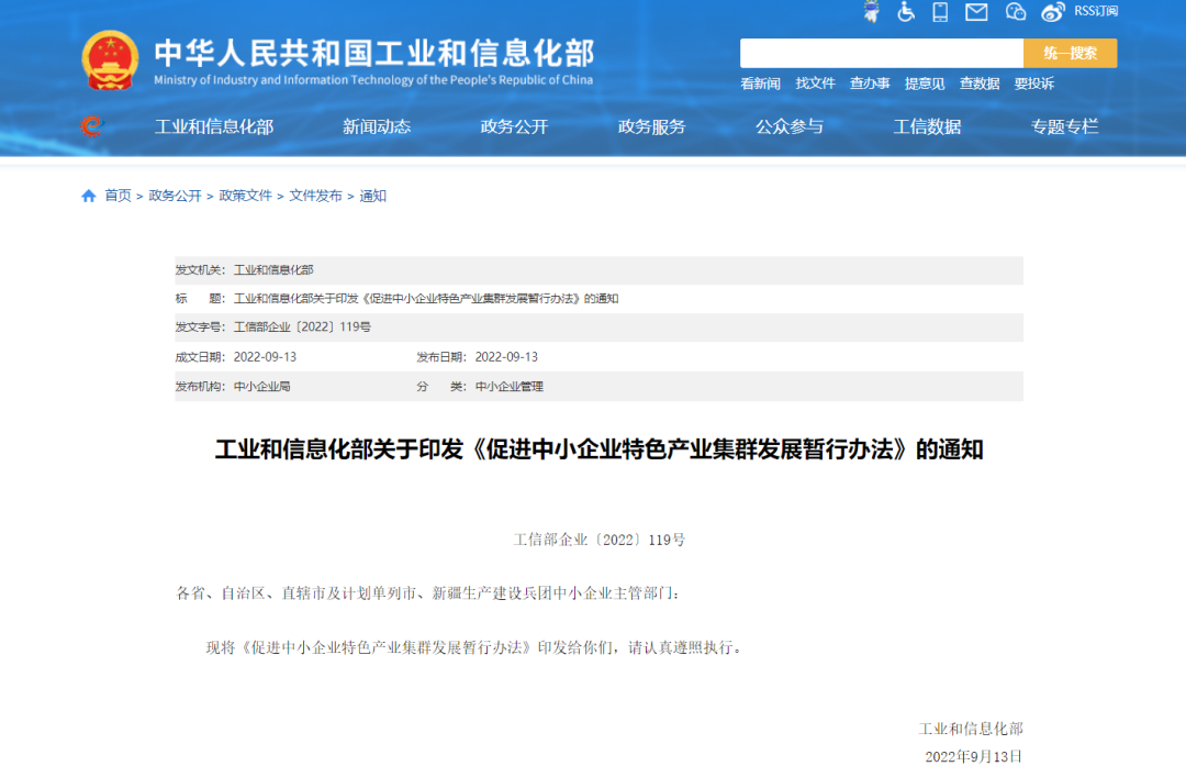 9月13日,工信部印发《促进中小企业特色产业集群发展暂行办法》,力争“十四五”期间,在全国范围内认定200个左右集群,引导和支持地方培育一批省级集群。《办法》自2022年9月13日起实施。