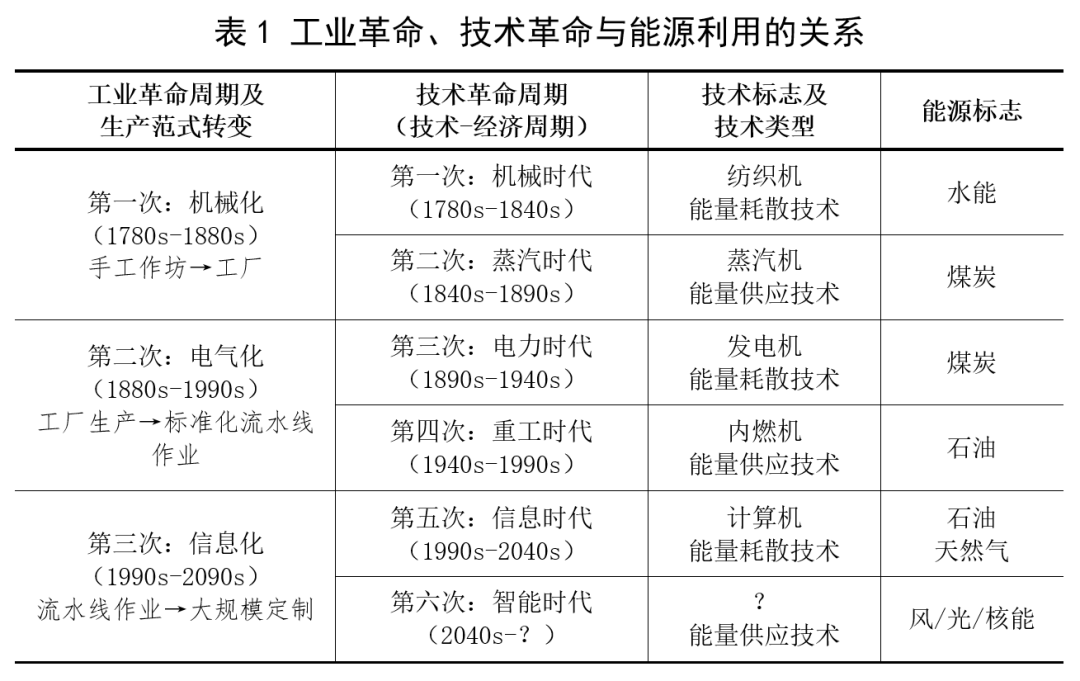 工业革命(产业变革)指的是工业化范式发生变化的过程,包括工业生产方式、组织管理模式的变化等。从历史规律来看,每次工业革命包含两个“技术-经济”周期,每个周期都有能源的开发利用贯穿底层逻辑,第一周期消耗既有能源扩充新的产业,第二周期开发自然界新的能源孕育新的产业,“技术-经济”周期就这样在能量耗散类技术革命和能量供应类技术革命之间进行转换,推动工业文明路径持续演化(如表1所示)。第一次工业革命以纺织机为工具,以蒸汽机为动力,水能和煤炭先后作为能源基础,实现了手工作坊向工厂制的转变,人类由此迈入机械化时代,机械化生产成为主流工业生产范式;第二次工业革命以发电机为工具,以内燃机为动力,煤炭和石油先后作为能源基础,实现了工厂制向公司制的转变,人类由此进入电气化时代,大规模标准化流水线生产成为主流工业生产范式;当前,世界正处于第三次工业革命的前半段周期内,预计将在2040年左右完成并进入后半段。目前已经看到的是计算机成为主要生产工具,但新的动力基础还不明朗,出现化石能源与新能源并存和转化的现象,由此人类从电气化时代迈入信息化时代,并越来越向智能化的方向发展,工业生产方式由标准化流水线作业向大规模定制和个性化生产的范式转变,工业经济将逐步演化为数字经济。