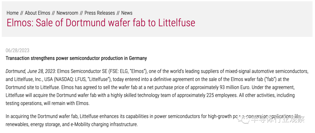 而赛微电子没能买到的Elmos,却即将花落美国公司Littelfuse。美国时间2023年6月28日,Elmos宣布已同意以约9300万欧元的净购买价出售晶圆厂,该厂拥有一支由约225名员工组成的高技能技术团队。此外,Elmos和Littelfuse已同意达成一项明确的多年产能共享安排,初步期限持续到2029年,Elmo 购买晶圆厂生产的一定数量的晶圆。该交易的交割预计将于2024年12月31日生效,并须满足某些交割条件和监管部门的批准。通过收购多特蒙德晶圆厂,Littelfuse增强了其在功率半导体方面的能力。