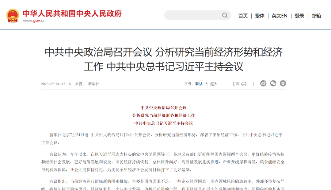 新华社北京7月24日电中共中央政治局7月24日召开会议,分析研究当前经济形势,部署下半年经济工作。中共中央总书记习近平主持会议。