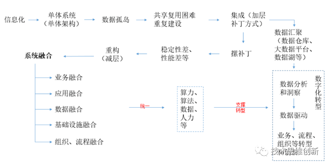 数字化转型,并不是简单的使业务数字化,而是利用技术去分析、洞察业务数据之间的关系和隐藏的价值。以数据驱动,需要将数据以标准化、规范化、高质量进行整合在一起,最简单的方式就是不去做转换,使数据从源头、从产生的地方就遵循同样的标准和规范,也就不会有质量问题,无需数据质量平台。随着业务系统的逐步重构和替换,从而实现“数据融合”、“业务融合”、“应用融合”、“基础设施融合”、以及“组织融合”,在完成过程“系统融合”能力中实现企业全局数字化和转型。