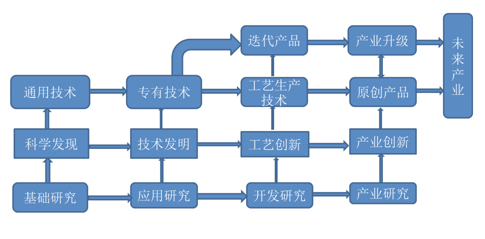 (二)三项技术的关联协同。新型产业形成的源头是原始创新的产品,原创产品创新依赖支持该产品的相关通用技术和专有技术,但该产品能够走向商业化成功则与该产品的生产工艺制造技术的创新成功密不可分,因为没有相关工艺制造技术的创新成功,原创产品就不可能实现高品质的大规模生产。未来产业的形成需要通用技术、专有技术与工艺制造技术这三类技术分别投入、协同创新,如果缺少任一方面,原创产品就成不了未来产业,即便其获得了发明专利,也成就不了商业化成功。因此,三项技术的一致性突破和关联协同,就成为形成布局未来产业成功的关键。由于通用技术的创新发展依赖科学发现,专有技术的创新依赖技术发明,生产工艺生产技术的创新依赖企业制造工艺技术的创新,而它们又分别对应基础研究、应用研究与开发研究的投入与成果,而这三类研究创新的主体不是同一主体,这样就产生了各自的利益诉求不同以及三者之间的协同合作问题。