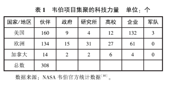 从“国之重器”科技项目变为“国际级”独苗科技项目。由于韦伯项目的“独苗”性质,且远远超出了欧洲、加拿大的科技实力,因此吸引到欧洲、加拿大的一流科学家,他们推动欧洲、加拿大科技决策者“上赶着”要求参与项目研发及承建,因为只有成为项目贡献方,待项目完工后才能拥有更多的使用资格,更多的使用资格必然意味着增大了欧洲、加拿大科学家问鼎诺奖的可能性。一方面,吸引精锐国际资源的主动权完全握在NASA手中。NASA引入欧洲航天局调动欧洲14个国家、134个机构的科研资源(见表1),为项目投入约15亿美元,把升空等环节外包出去。NASA对加拿大相关科技界精华力量的利用更为彻底,引入加拿大航空局调动14个机构的科研资源,为项目投入约5亿美元,承担了研发、工程、配件制造等功能。由于韦伯项目有涉军性质,NASA还专门为数十位加拿大顶级科技人才申请了“绿色通道”,从而获得美国军方的相关许可,让加拿大人才进入绝密的项目设计和制造过程。另一方面,由于韦伯项目的“独苗”性质,且远远超出欧洲加拿大的科技实力,NASA始终掌握对项目的主导权。外包给欧洲、加拿大的都是一些次要环节,战略规划、原型机设计、系统集成、组装测试等关键环节都被NASA掌控。