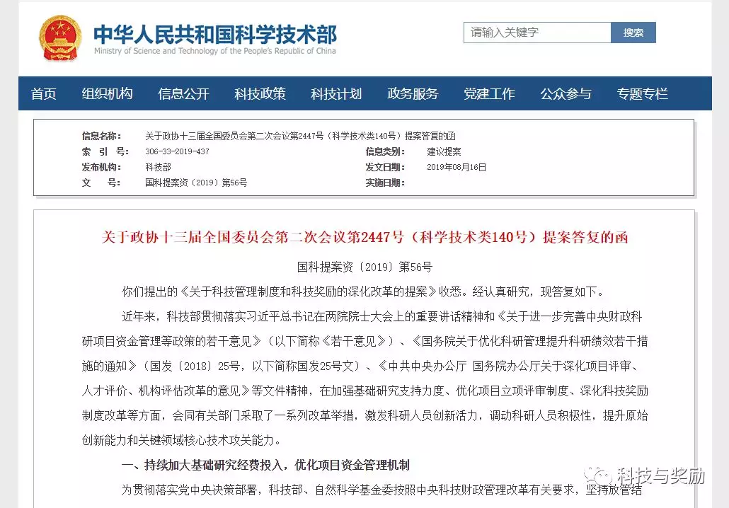 科技部:关于科技管理制度和科技奖励的深化改革的提案答复