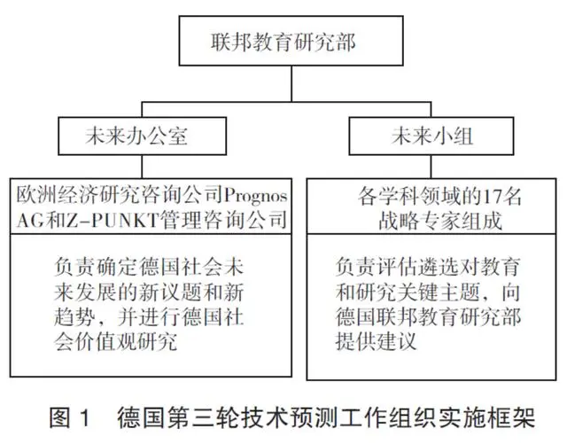 德国联邦教育研究部依托社会智库机构和各领域战略专家,成立了“未来办公室”和“未来小组”,共同推进第三轮技术预测工作的具体实施,如图1所示。“未来办公室”成员包括欧洲经济研究咨询公司Prognos AG和Z-PUNKT管理咨询公司两家智库机构,负责确定德国社会未来发展的新议题和新趋势,并进行德国社会价值观研究。“未来小组”由来自各学科领域的17名战略专家组成,主要负责评估遴选对教育和研究关键议题,向德国联邦教育研究部提供建议。技术预测专家和企业家科尼莉亚·达海姆(Cornelia Daheim)与物理学家、哲学家和技术评估专家阿明·格伦瓦尔德(Armin Grunwald)教授共同担任“未来小组”的主席。