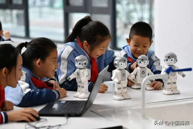 河北省石家庄市融创中心第一小学,学生与人工智能设备进行互动,体验科技魅力。(图片由CNSPHOTO提供)
