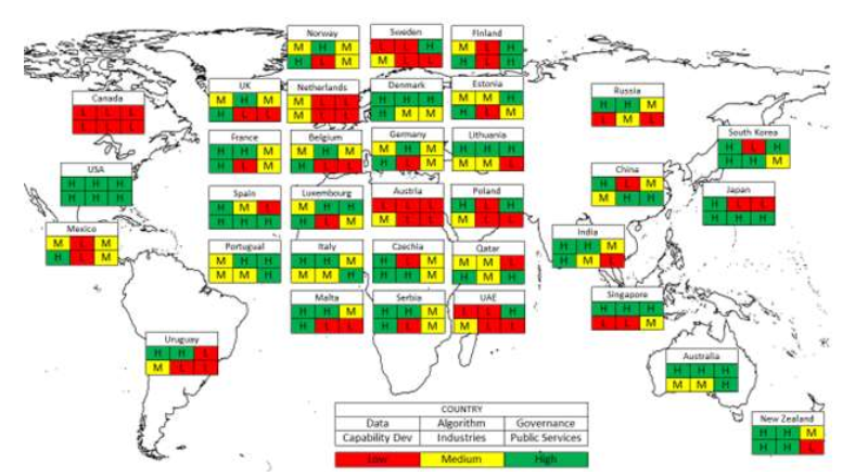 2023年12月13日,美国布鲁金斯学会发表最新评论文章《全球人工智能战略集群分析》,从数据管理、算法管理、人工智能治理、能力发展、行业和公共服务导向6个维度出发,分析全球34个国家的人工智能战略,将其分为高、中、低三个等级。元战略编译文章重点内容,为分析各国的国家人工智能战略提供参考。