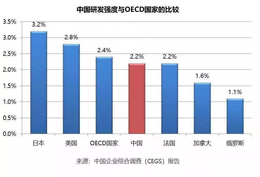 这意味着,中国制造业的平均研发强度已经与法国等发达国家持平,接近OECD国家的平均水平。但是,我国距离美国、日本等强国仍有一定差距。