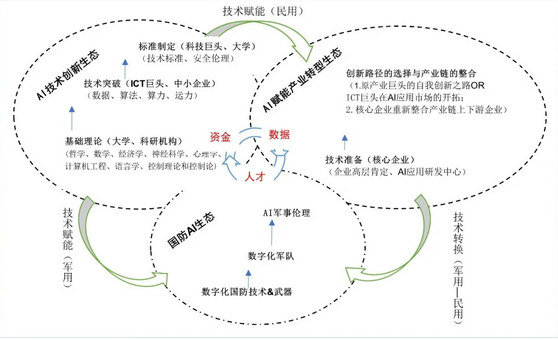 为了克服这种零敲碎打的局限,笔者通过广泛阅读国内外在AI技术创新领域的文献,综合考量了人工智能在技术创新、产业赋能、国防安全等多个维度的特征。在此基础上,笔者绘制了一幅全面的人工智能生态系统全景图(如图1),旨在提供一个宏观的视角,更全面地理解AI领域的复杂性和多维性。