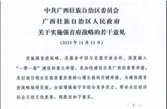 与南昌同步而行的还有南宁。 2019年11月,广西出台《关于实施强首府战略的若干意见》,表示将借鉴南昌、合肥、南京等省会城市先进经验,做大做强南宁。