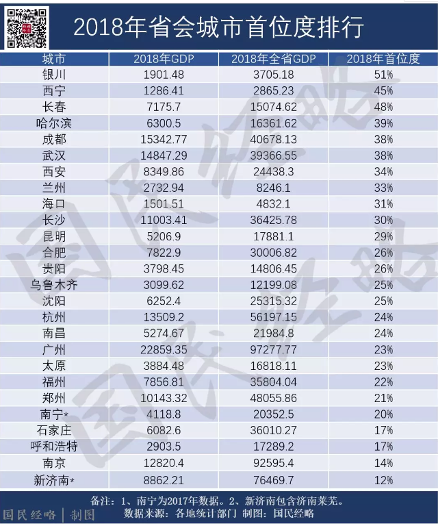 当地表示:首府强则广西强。南宁的“强首府战略”(自治区省会,俗称“首府”)终于横空出世。 事实上,这一年,南宁先后获得自贸区、西部陆海新通道的政策加持,南宁的城市地位得到提升,可以说,在出台意见之前,“强首府“战略就已落地。 与江西、广西一样,内蒙古也在行动。 2019年9月,呼和浩特发出“我们要建设一个什么样的首府?”之问。 答案可谓不言而喻:强首府。 02 在一众“弱省会”里,最突出的并非南昌南宁呼和浩特,而是南京、济南。 在省会城市里,南昌南宁呼号浩特的首位度都位居倒数后十位,但南京位居倒数第二位,而济南则一直处于垫底位置。