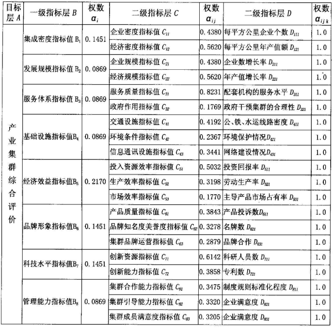 第一,集成密度指标反映的是产业在地理上的集中度。集成密度是产业集群最重要的外部特征,该指标也是反映产业集群象参量的主要指标。集成密度可以定义为P=N/V,其中,P 代表集成密度;N代表集成单元的数量;V代表集成空间。该公式应用于产业集群集成密度,则表示为:产业集群密度=具有某种公共属性的集合企业个数/平方公里其意义类似于物理学中“会物质的多少”,它对集群外集成单元的集成内力的影响是明显的,反映的是产业集群中企业的集中度,而不是产业集群中单个企业的大小。第二,发展规模指标反映产业集群发展的规模大小以及经济总量大小,也是产业集群重要的外部特征。第三,服务体系指标反映产业集群内配套服务体系的完善程度。这也是产业集群重要的外部特征。服务体系为成员企业提供生产、技术、资金、信息、营销、供应、科研、人才培训、行政及法律咨询、管理咨询等方面的服务,在企业之间起协调作用,帮助企业建立各种横向生产协作网络等等,产业集群的发展,离不开社会化服务体系的支撑。第四,基础设施指标反映产业集群及其周边的基础设施建设情况。这也是产业集群重要的外部特征,包括道路、环境保护、水、电、汽、邮、网络等基础设施建设。第五,经济效益指标反映产业集群的盈利能力,是集群最重要的内在性质,体现集群对更多的产品生产企业和相关服务企业,以及各种人才、资金等生产要素的吸引力。第六,品牌形象指标反映产业集群的品牌形象,品牌的知名度与美誉度是产业集群社会形象的表现形式。第七,科技水平指标反映产业集群的创新能力和学习能力,体现产业集群的核心竞争力。第八,管理能力指标反映产业集群的内部管理水平,主要体现在产业集群的规则建设和文化建设以及集群引导能力。在一级指标选定的基础上,再分别对8个一级指标作进一步细化工作,选取了20个二级指标。二级指标的选取综合考虑了上一级指标的质参量(内在性质)和象参量(外部特征)两个方面特征,并且还需严格遵照简明可操作性和通用可比性原则。产业集群评价指标选定后,各级指标的评价项目的指标权重是运用 AHP 层次分析法,配合专家评分法(Delphi)计算得出,并通过单层排序的一致性检验和组合一致性检验。最后,可采用线形加权求和得出产业集群的综合评价得分。参考资料:[1]周碧华等.产业集群综合评价指标体系实证研究.管理科学文摘-THE END-