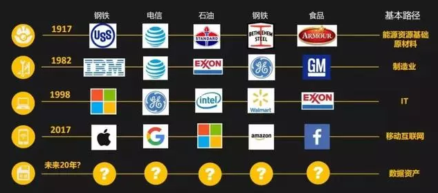 过去100年来,美国五大市值公司的嬗变可见一斑: