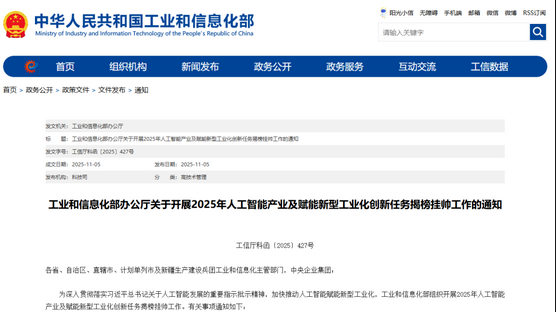 11月5日,工信部发布《关于开展2025年人工智能产业及赋能新型工业化创新任务揭榜挂帅工作的通知》,这是工信部首次开展“人工智能+制造”、人工智能产业方向的揭榜挂帅工作。